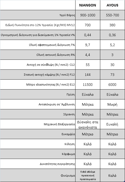Δίνονται στοιχεία του Ayous συγκριτικά με ένα άλλο, δημοφιλές ξύλο στην Ελλάδα, το Νιανγκόν: